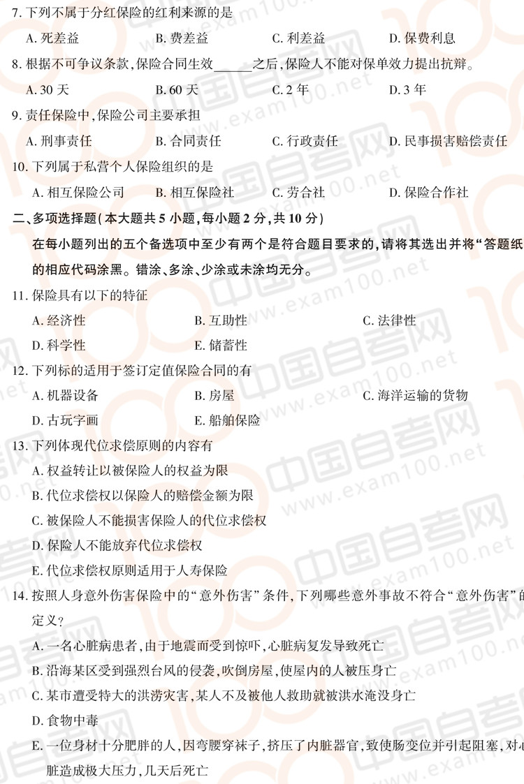 浙江2018年10月自考00079《保险学原理》真题
