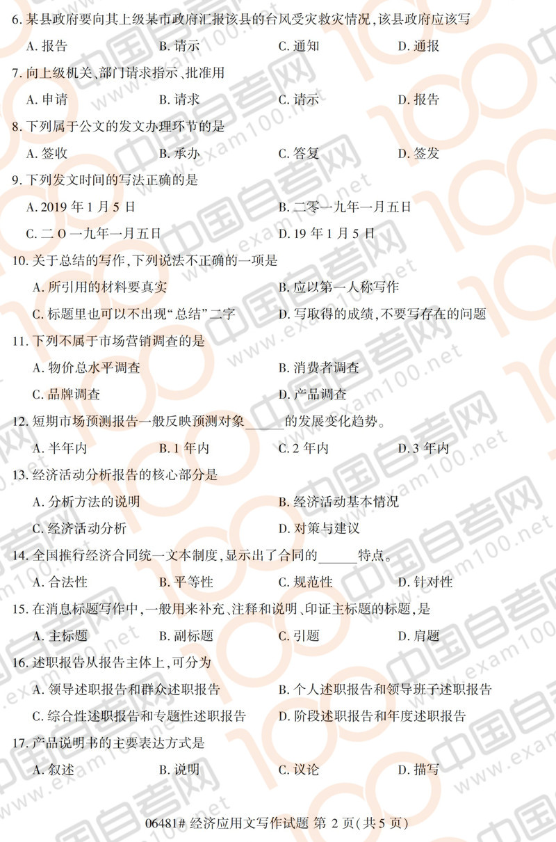 浙江2019年10月自考06481《经济应用文写作》真题
