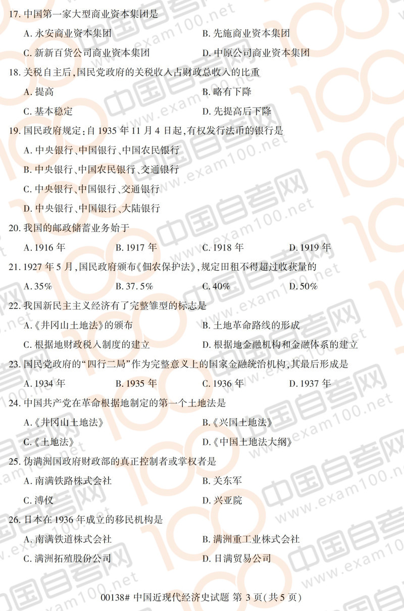 浙江2019年10月自考00138《中国近现代经济史》真题