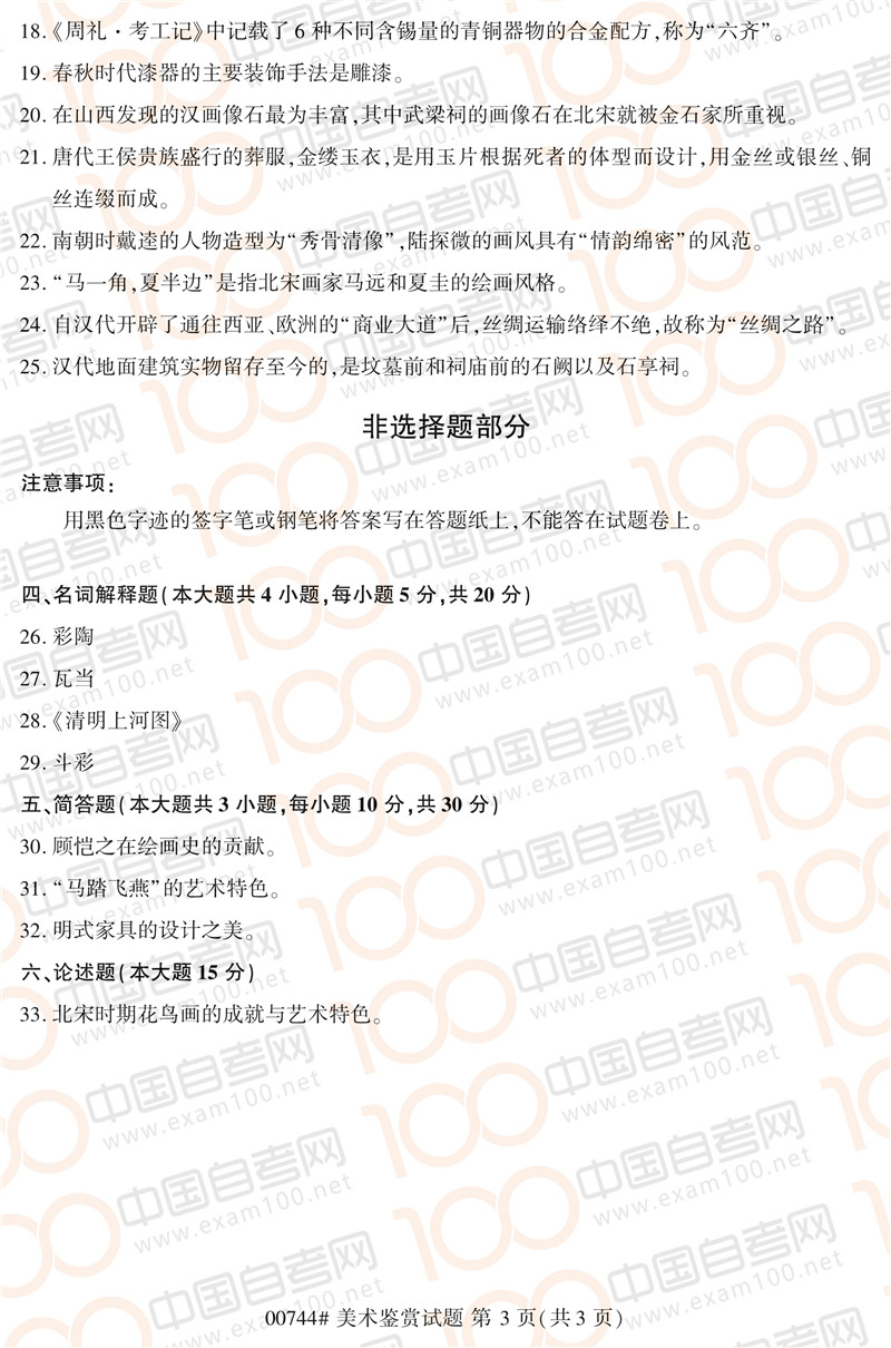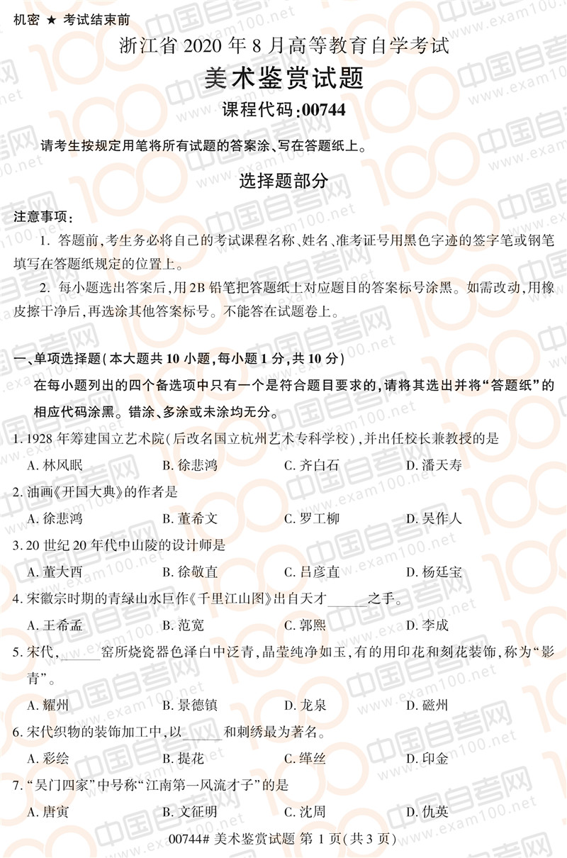 浙江2020年8月自考00744《美术鉴赏》真题