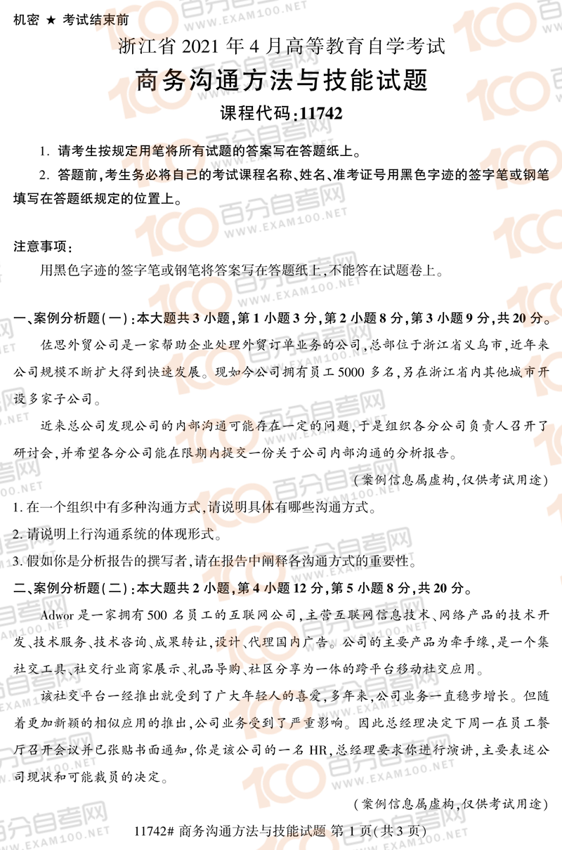 浙江2021年4月自考11742《商务沟通方法与技能》真题