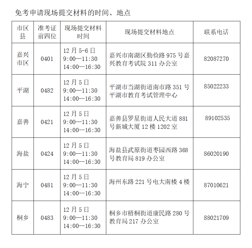 一、课程免考申请登记的时间为11月25日00:00-12月4日24:00,现场提交材料的时间及地址见公告底部表格。考生需按时进行课程免考申请登记和提交材料,逾期不受理。